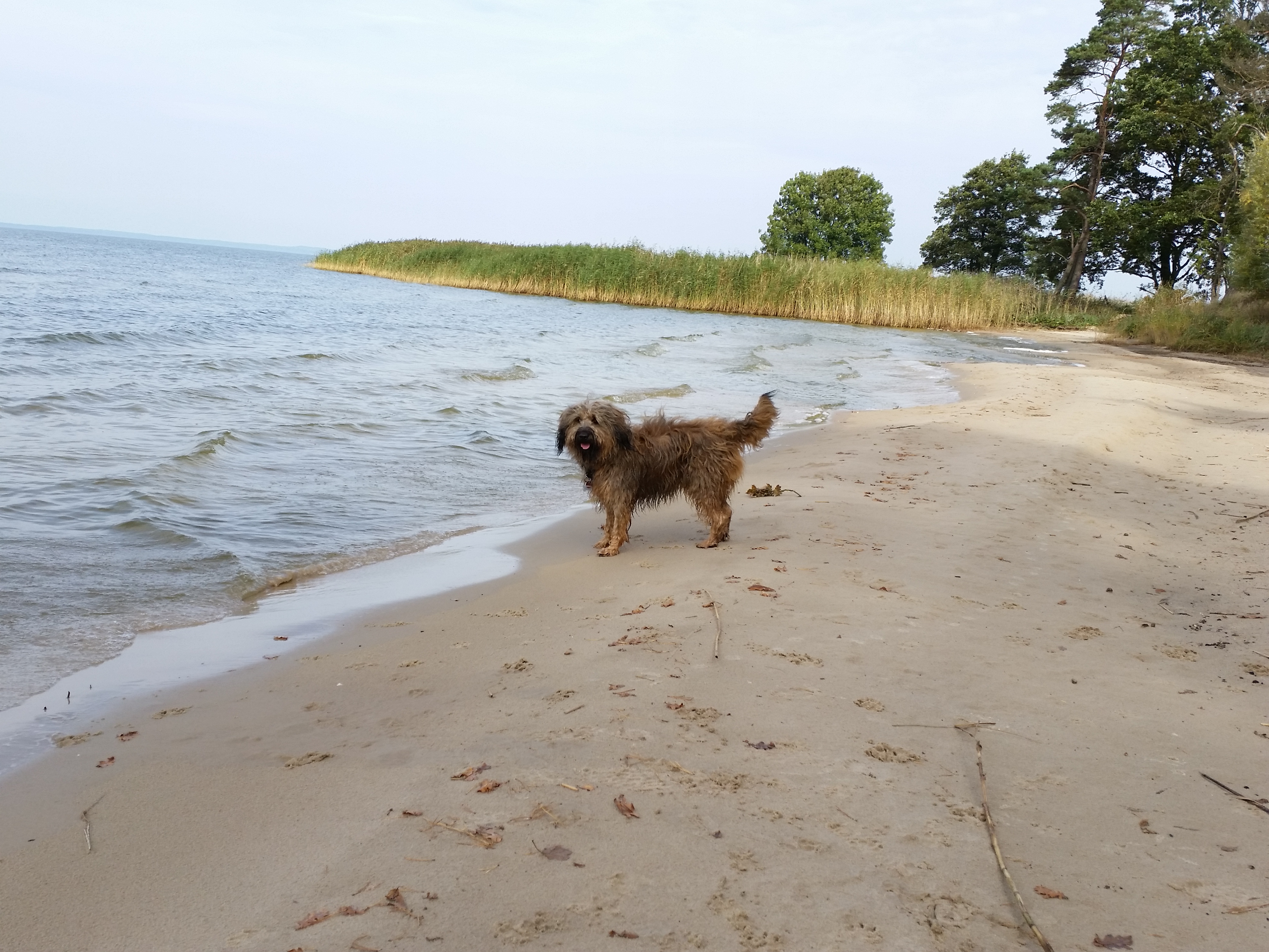 An dieser Stelle kommt nun Dänemark wieder ins Spiel. Wer wie wir viele Jahre in Jütland Urlaub machte, der ist auf stundenlange Spaziergänge an kilometerlangen leeren Stränden eingestellt. Nur, wo war hier an der Ostsee, hier am Stettiner Haff eigentlich der Strand. Nach langer Suche haben wir IHN dann gefunden. Knapp 100 Meter lang und 10 Meter breit. Hä? O.k. hier auf der Karte gab es noch mehr Strände, wir haben sie alle angefahren, aber: jeder davon hatte ungefähr dieselben Abmessungen, o.k., der ein oder andere war etwas größer, aber nur marginal. Herta und Paule war’s egal. Sie genossen das kühle Nass in vollen Zügen: Attacke und rein! Über Micha und mir dagegen schwebte ein großes Fragezeichen, nein es waren mehrere. Gott was sind wir für Penner, hätten wir uns mal besser vorbereitet, dann ständen wir jetzt nicht so dumm da. Doch der Verwunderung folgte schallendes Gelächter und wir konnten quasi nicht mehr damit aufhören. So what! Machen wir das Beste daraus. Und das taten wir!