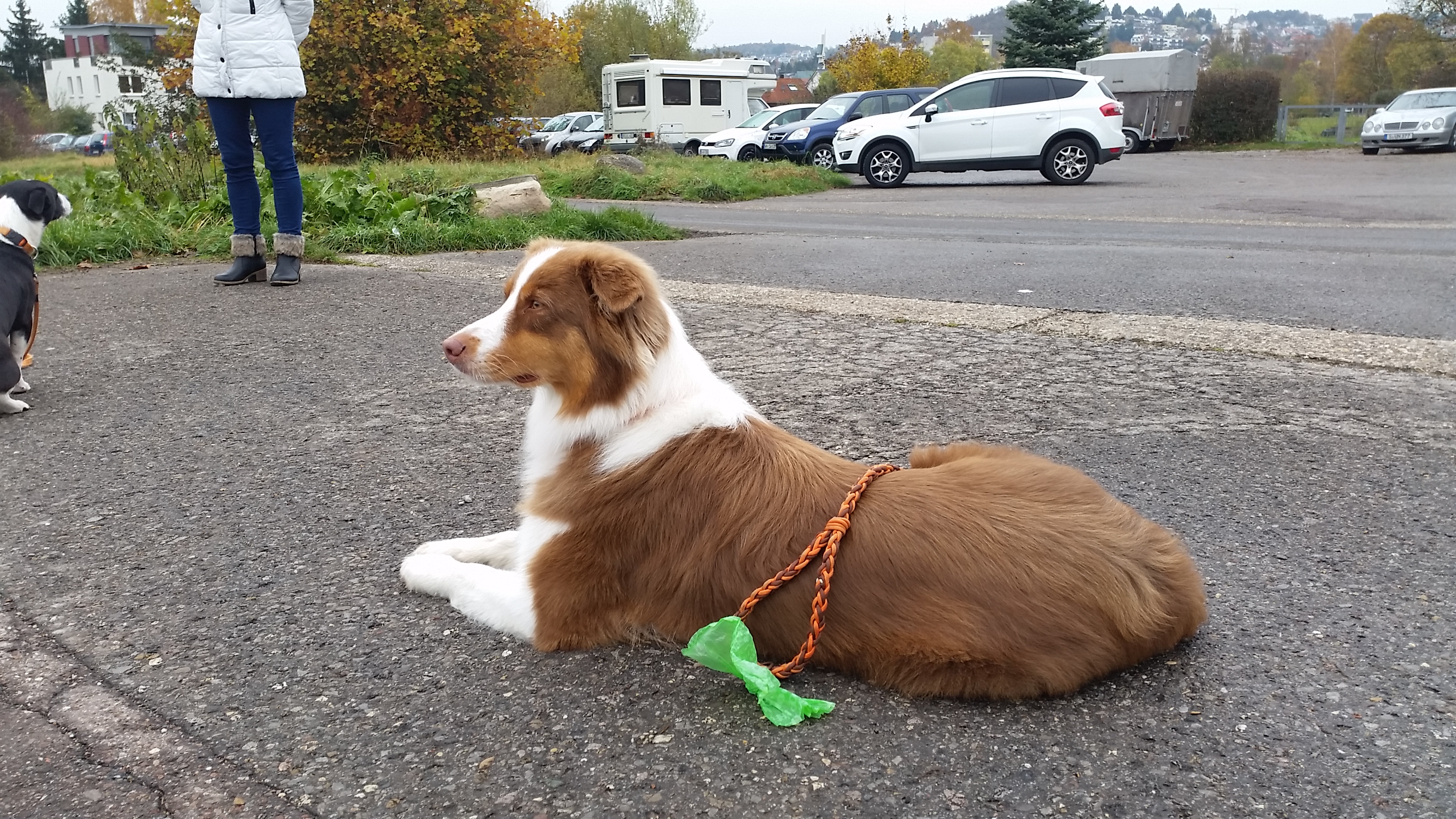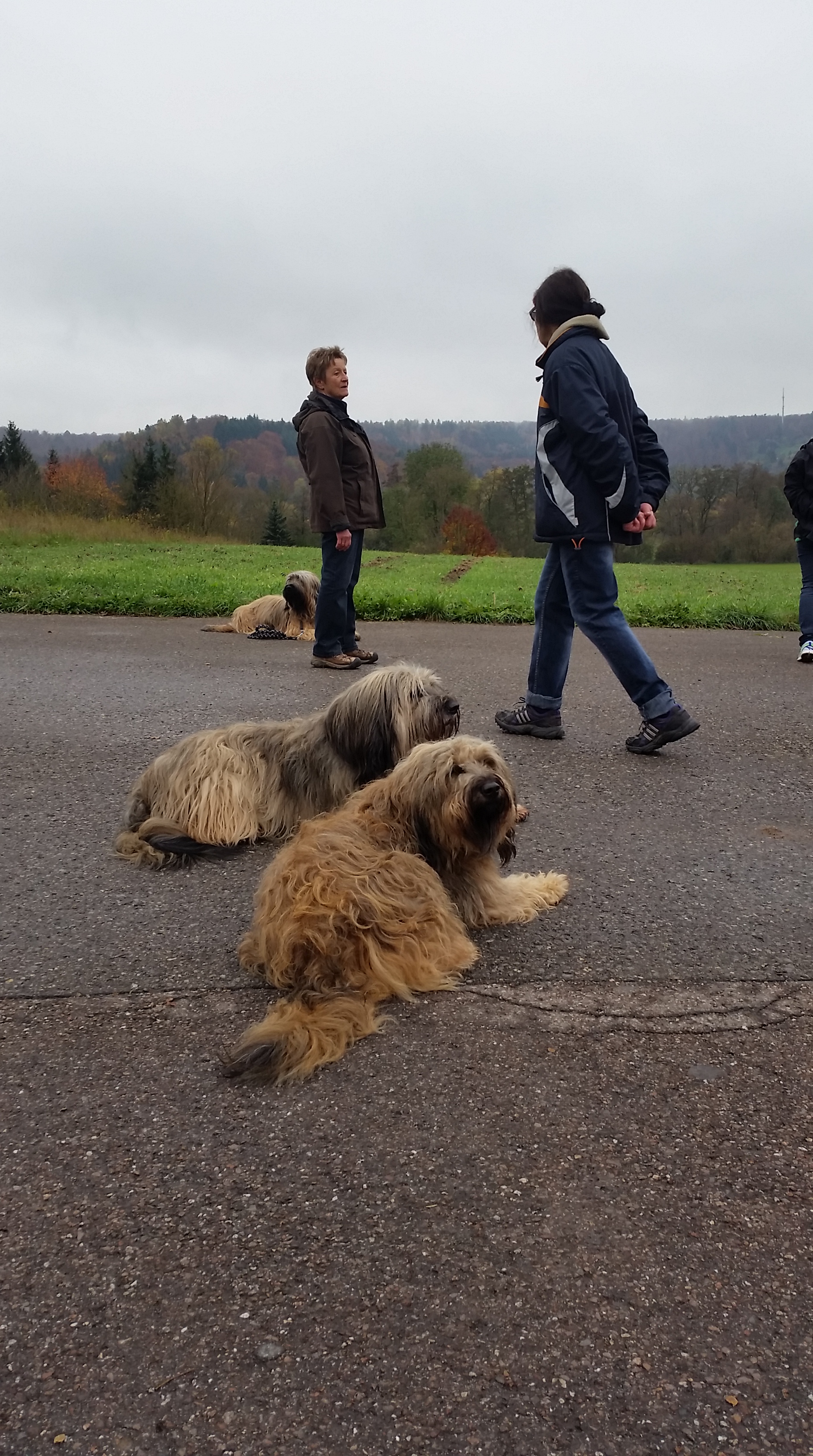 Wir haben wie immer brav mitgemacht. Sind schön an den anderen vorbeigelaufen, ohne auch nur einmal Nasenkontakt … pffffff …. wobei ein Küsschen mal mit Aragon, mal mit Feger doch so schön ist … Wir sind auch schön liegengeblieben, obwohl die ganzen Menschen wie wild um uns herumgetingelt sind. Aber Platz ist Platz – ganz klar!
