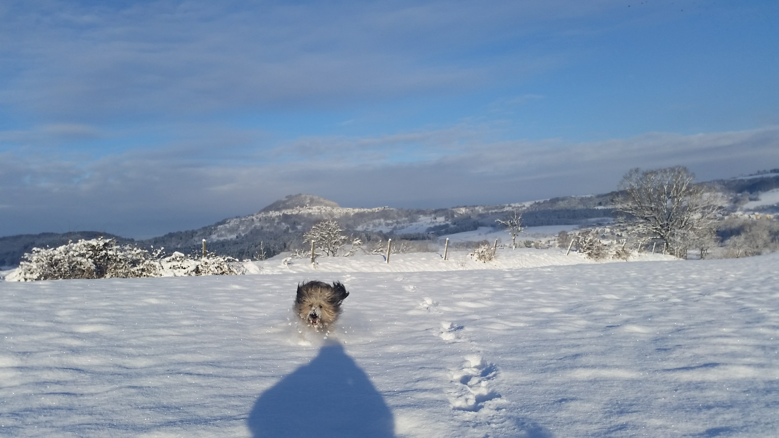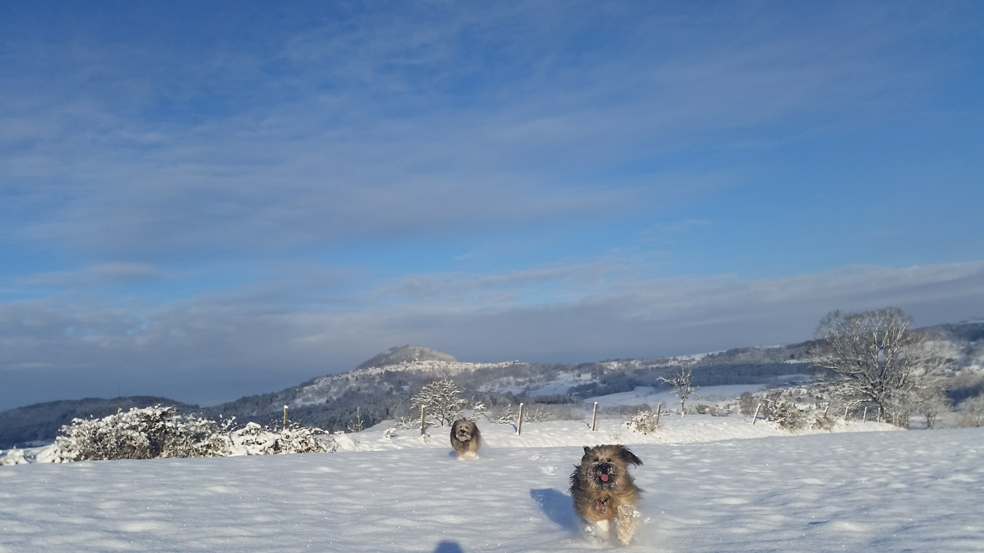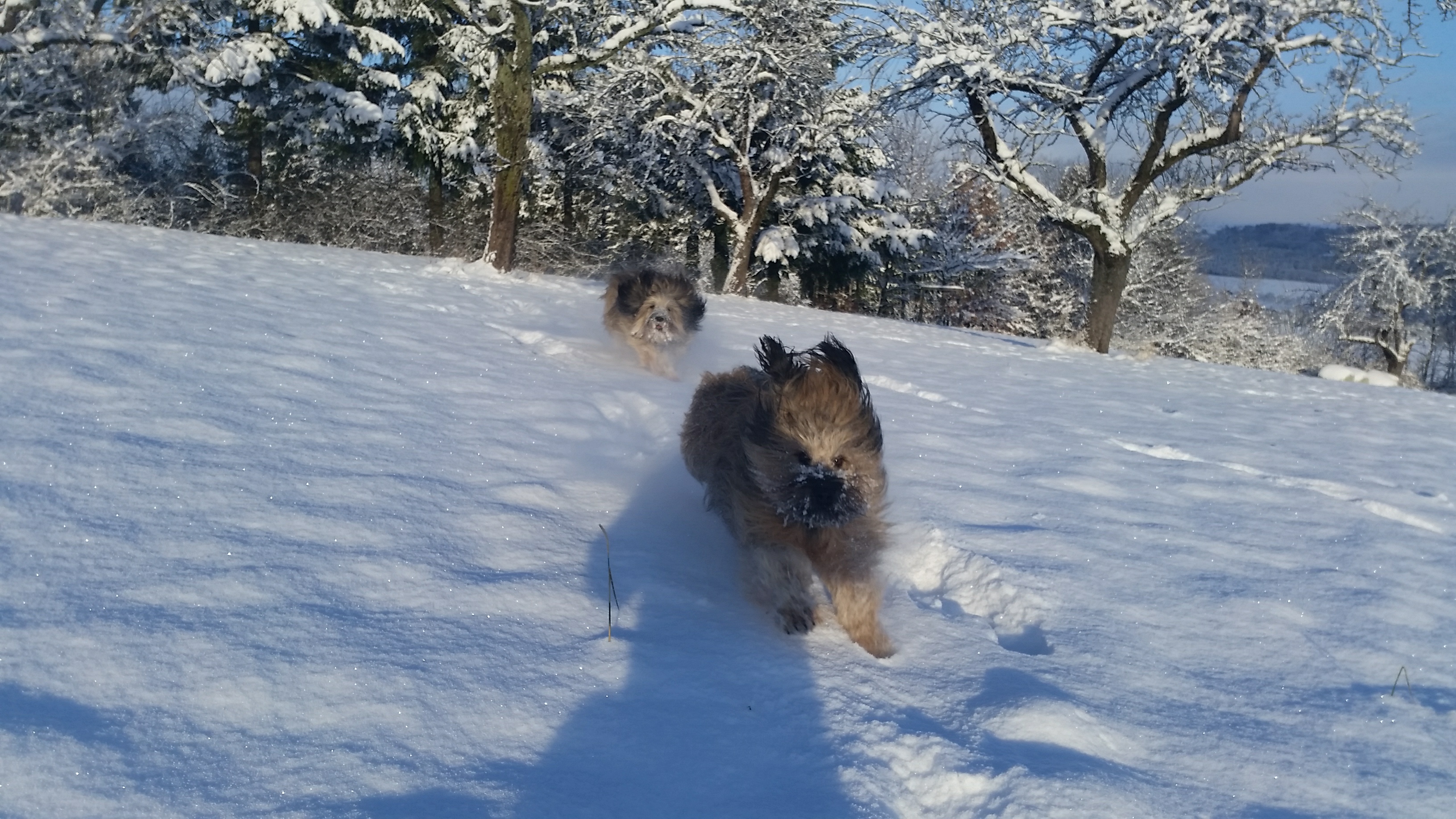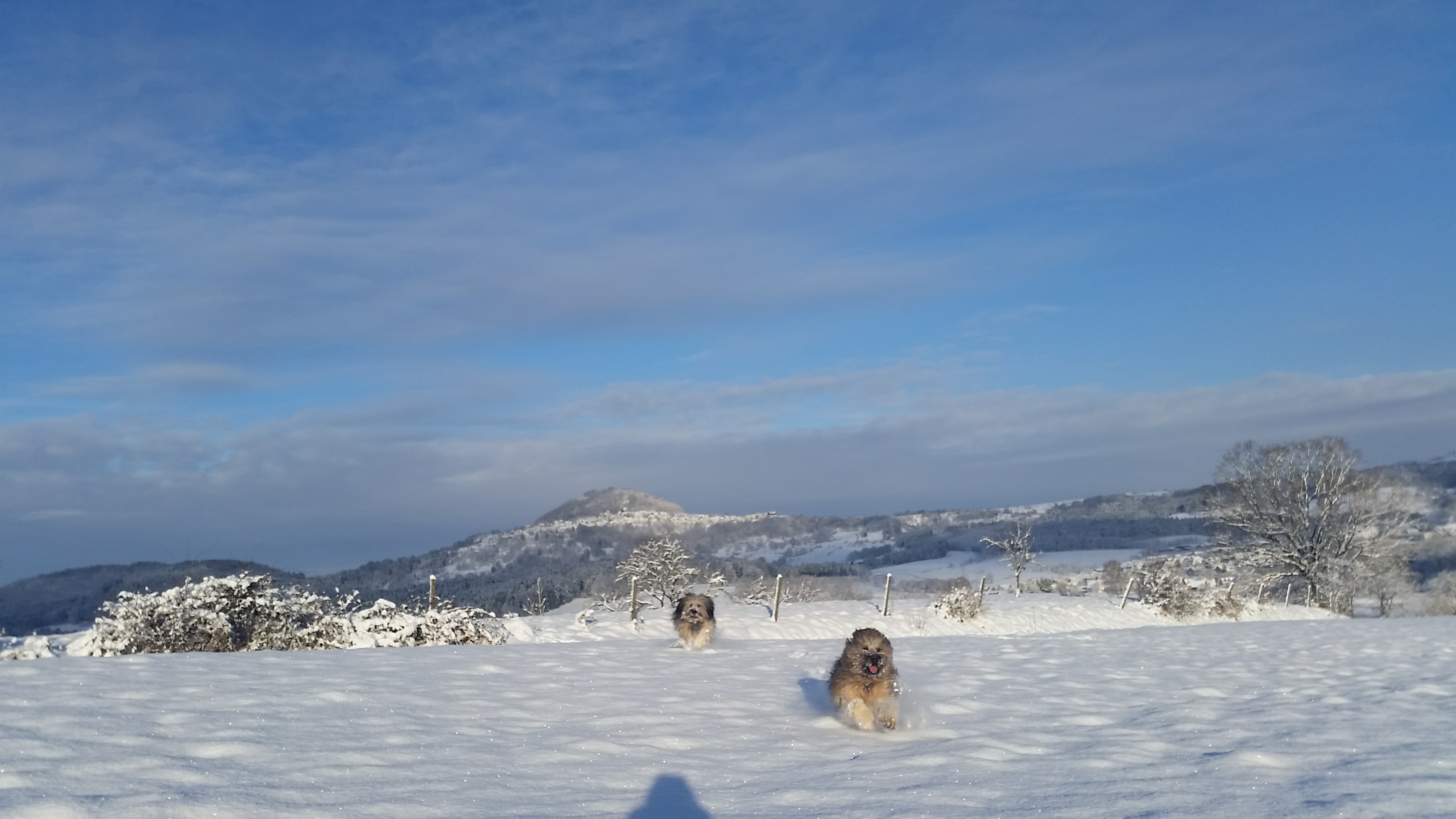 Schnee, Schnee, Schnee, überall Schnee. Bei euch auch? Wir gehen darin geradezu unter. Aber so lange zwischendurch auch immer mal wieder die Sonne scheint, find ich den Schnee klasse. Meine beiden Gos d’Atura Herta und Paule brauch ich gar nicht zu fragen … im Schnee zu toben, scheint das Größte für die beiden zu sein. Manchmal fliegen derart die Fetzen, dass ich vor lauter Spielen und Toben, kaum mehr die Hunde sondern nur noch Schneewolken sehen kann.