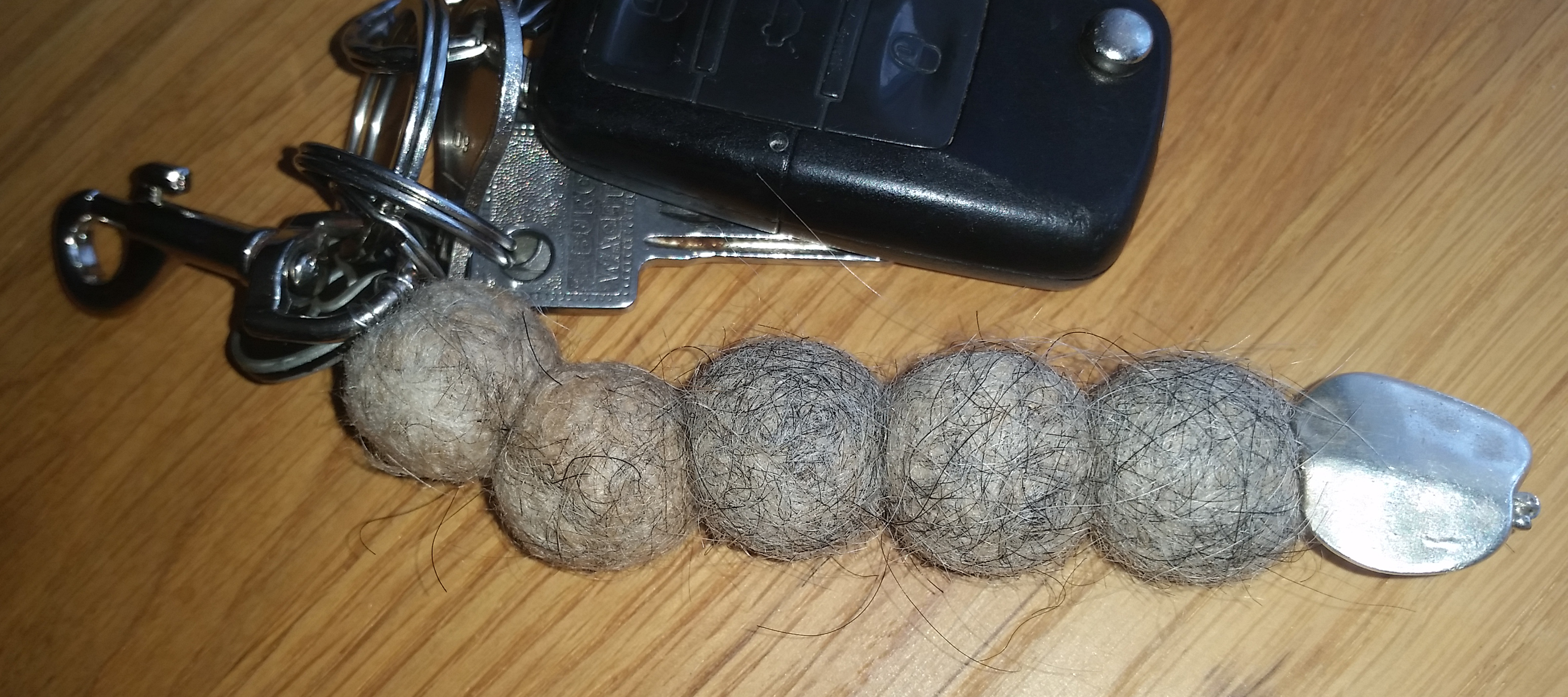 Hundewolle ist übrigens für den Filzprozess wie gemacht, darüber hinaus ist sie auch noch selbstreinigend. So bleiben Taschen, Gürtel und Schlüsselanhänger lange schön. Ich hab meinen Schlüsselanhänger nun schon über ein Jahr am Schlüsselbund hängen. Ihr könnt euch vorstellen, wie häufig man seinen Schlüssel in der Hand hat. Und was soll ich sagen, mein kleiner Kugeliger sieht immer noch aus wie am ersten Tag.
