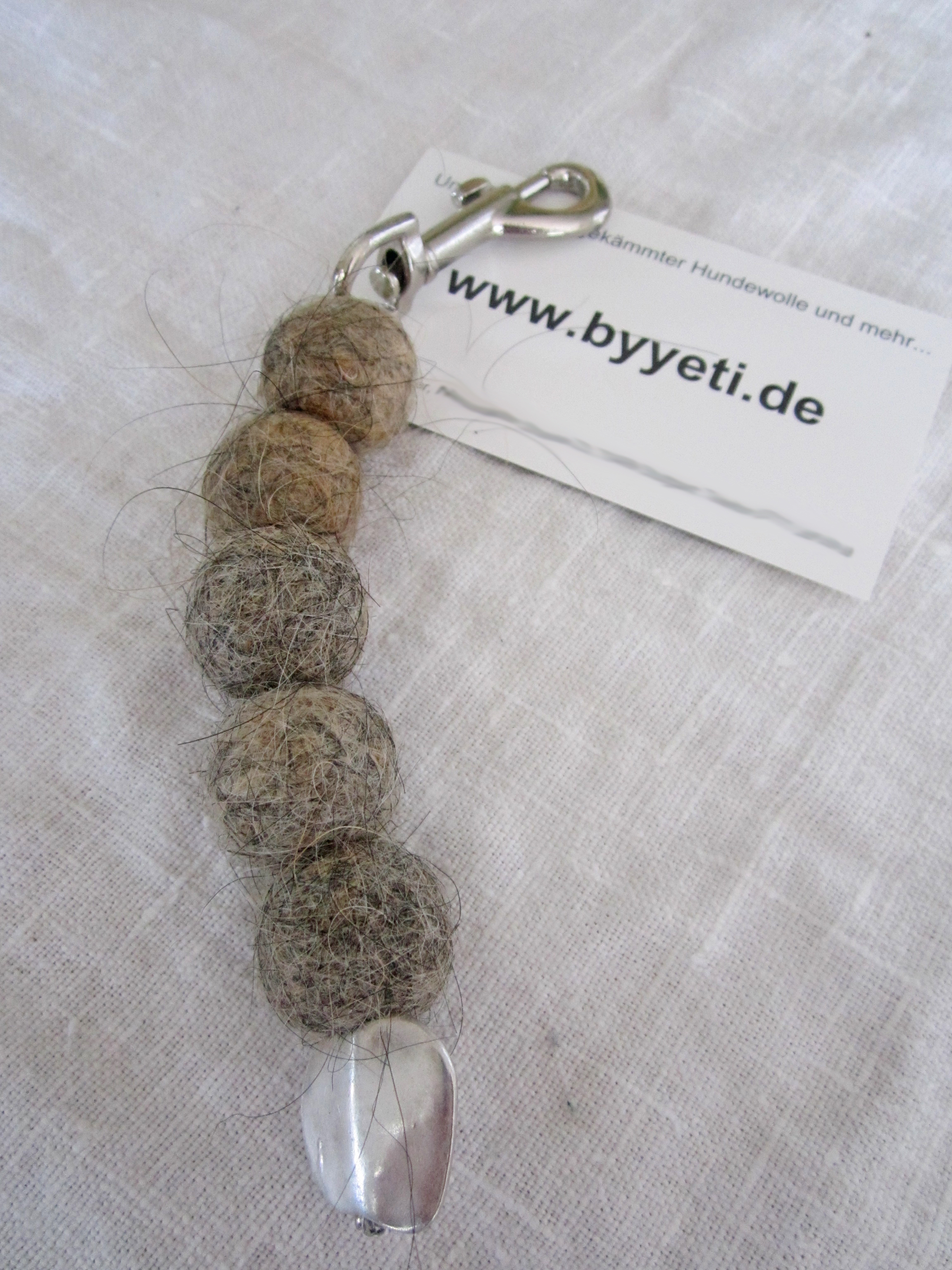 Gerade im Frühjahr zum Fellwechsel trifft‘s uns Hundemenschen haarig. Das Rauskämmen der sich lösenden Unterwolle ist oft schon ein Act. Wohin aber nun mit der ausgekämmten Wolle? Nicole Kälberer von „By Yeti Design“ hat da ein paar prima Ideen, die sie unter www.byyeti.de gerne an den Mann oder die Frau bringt. Nicole verarbeitet, bzw. filzt die Hundewolle zu so wunderbaren Dingen wie Anhänger in Herzform, Schlüsselanhänger mit Wollkugeln dran, Ledertaschen oder -gürtel mit aufgenähten Hundewoll-Applikationen und mehr.