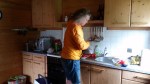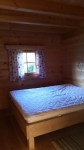 Wie gesagt, das Schmuckstück – durch und durch aus Holz gebaut – liegt auf 1500 Metern Höhe. Vor der Hütte ein kleine Terrasse mit Garten und einem Weitblick zum Niederknien. Innen gibt es eigentlich alles, was man fürs Bergleben benötigt und sogar noch ein bisschen mehr. Hereinspaziert, die Tür geht auf und man befindet sich direkt in der gut ausgestatteten Küche. Links eine kleine Garderobe, rechts viele volle Küchenschränke und ein Gasherd. Von der Küche geht es direkt nach links in die gute Stube mit gemütlichem Holzofen. Geradeaus kommt man in Schlafzimmer, Bad und Vorratskammer. Eine Treppe führt nach oben in einen weiteren Schlafraum mit noch einmal sechs Betten. Also grundsätzlich könnte man hier zu acht übernachten. Ich allerdings finde zwei Personen und zwei Hunde sind mehr als genug – vielleicht noch 2 Kinder dabei, das ist meiner Meinung dann aber genug. Zu acht möchte ich dort keine Woche sein. Das wär mir zu eng.
