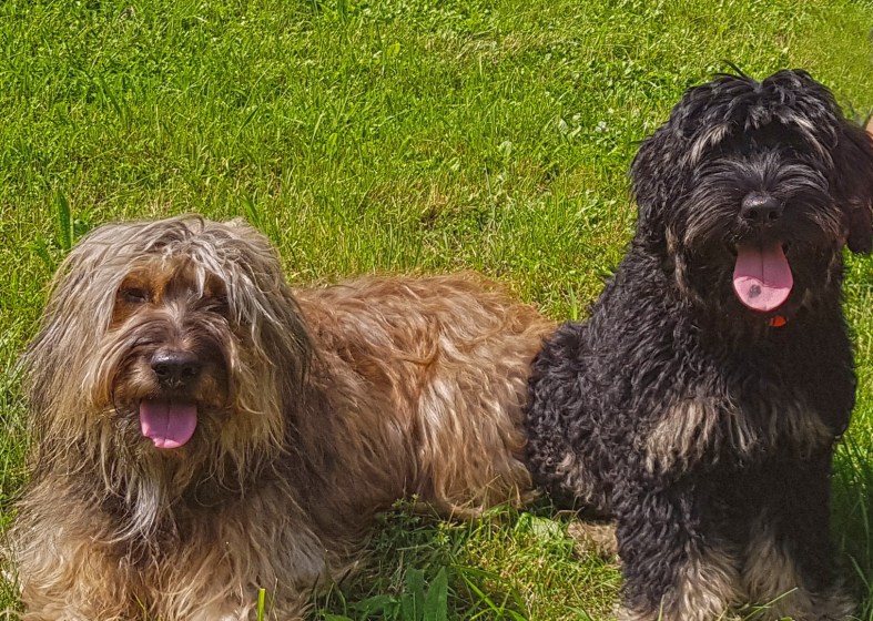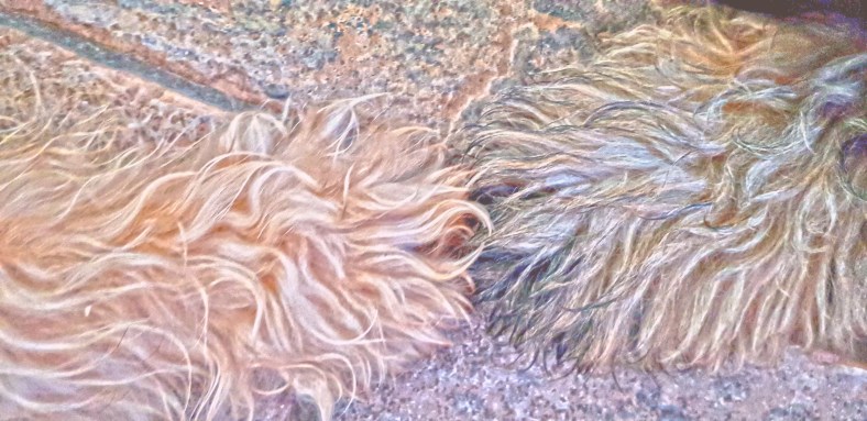 Doch dann zum Abschluss tut sich doch noch ein Abgrund auf. Von hinten kommt ein Jogger mit Hund. Micha läuft mit Herta an den rechten Wegesrand, ich links. Blöd, ja, auf einer Seite wäre besser, aber ich bin so auf Fritzle konzentriert, dass ich das gar nicht bemerke. Auf einmal schreits von hinten. „Wie soll ich da denn jetzt mit meinem Hund durchkommen, wenn ihr links und rechts steht. Ich führe meinen links, also steht gefälligst rechts.“ Hoppla, denke ich. Bedeute Micha zum mir rüber zu kommen. Nach links – ätsch, ein bisschen Herausforderung muss schon sein – und sage zu dem unfreundlichen Jogger: „Jetzt lauf vorbei und gib Ruhe.“ Sichtlich irritiert von meiner kurzen Ansage läuft er mit seinem Hund vorbei. Da wir links stehen, muss er ihn rechts führen. Was er nicht kann, wie überdeutlich zu sehen ist, denn es braucht viel menschliche Einwirkung, dass der Hund auch rechts bleibt. Was mich wieder in meiner Erziehungsmethode bestätigt, denn ich bringe meinen Hunden von Anfang an bei, auf beiden Seiten zu laufen, und habe da auch jeweils ein eigenes Kommando dafür.