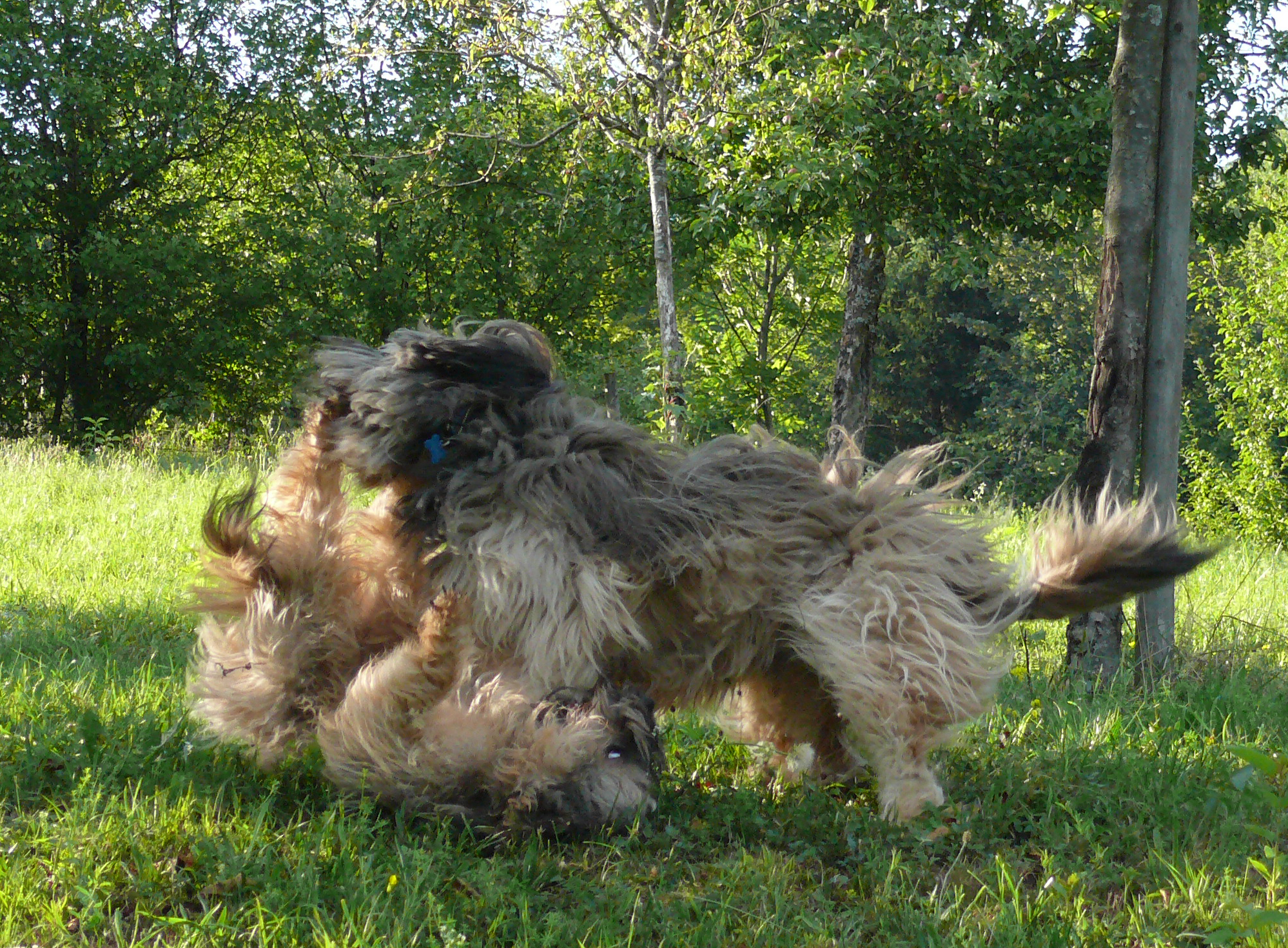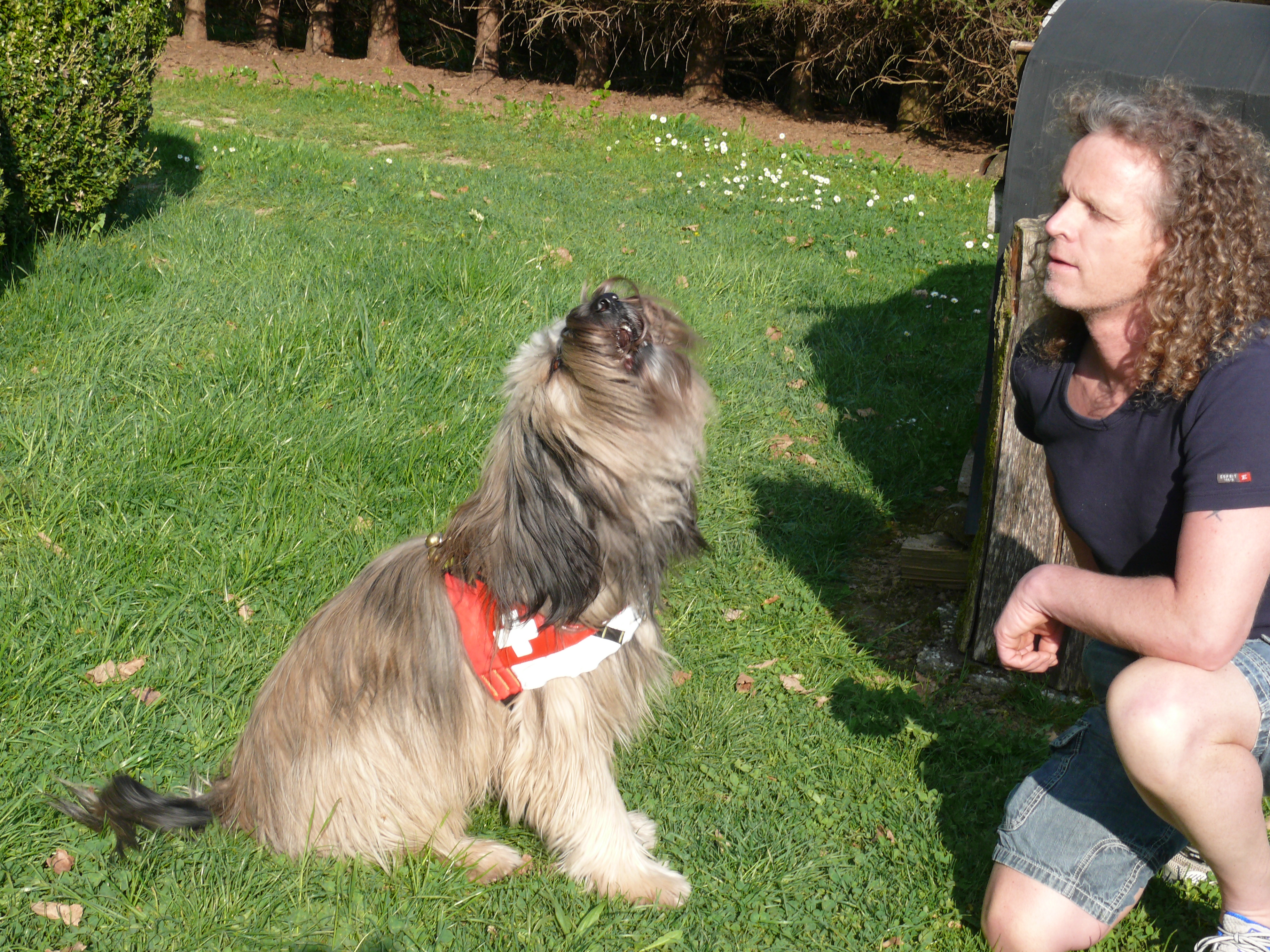 Oder neulich auf unserem Gütle (Gartengrundstück – keine Kleingartenanlage!!! Das bitte ich zu beachten). Ich wollte mit beiden mal wieder mit dem Dummy trainieren. Zuerst die Herta. Paule warte so lange im Platz. Klappt wunderbar. Dann ist der Paule dran. Herta wartet im Platz. Von wegen! In einem Anfall von Jetzt-Will-Aber-Ich-Hysterie springt mich das Luder an, pöbelt in Extremo, knabbelt mir in die Arme, krallt sich mit den Vorderläufen an mir fest. Hallo, was ist das? Einziges Hilfsmittel, Herta unter die Arme klemmen und festhalten, bis sie zur Ruhe kommt. Natürlich haben wir Zaungäste, wie sollte es auch anders sein. Kopfschüttelnd gehen sie ihres Weges. Grrrrr, super wie ich dieses Publikum liebe, die sind immer dann vorort, wenn ich wirklich souverän ausschaue.