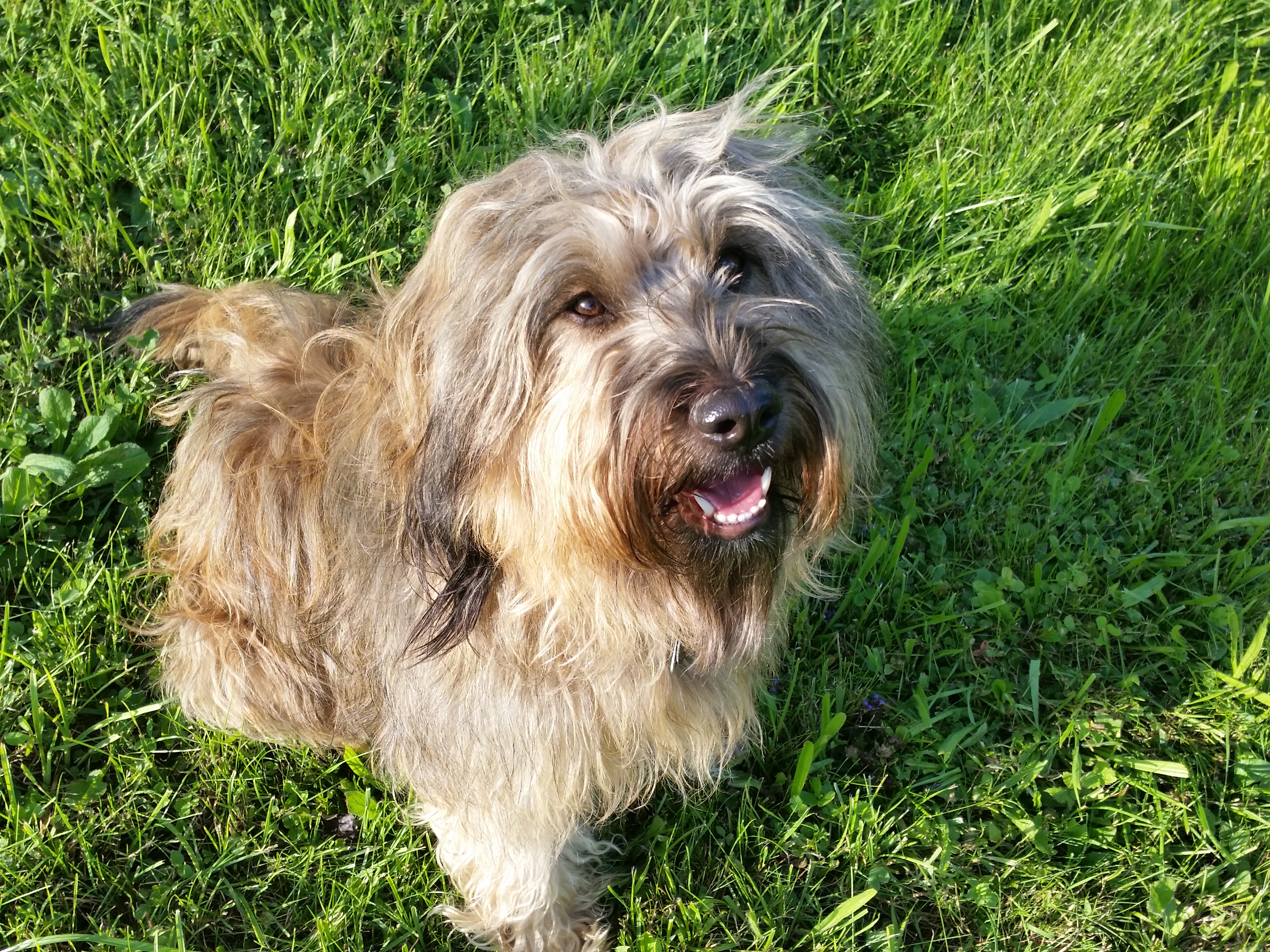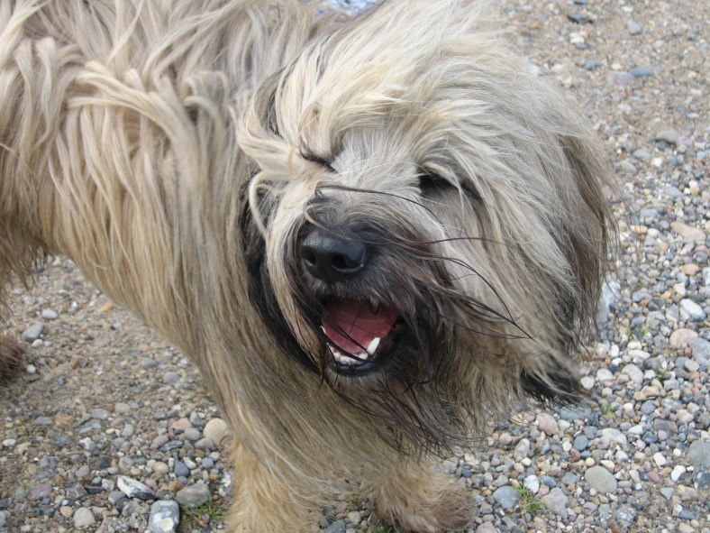 Dann war da noch die Sache mit dem Fell. Anfassen war ja über Monate kaum mehr möglich, Kämmen ebenfalls. Was blieb uns da anderes übrig, als eine komplette Schur. Halleluja, war das ein verfilzter Pelz, der dabei herunterkam. Und natürlich stellte sich auch hier die Frage – wie machen wir das überhaupt mit dem Hundefriseur, schließlich lässt der Pauli sich nicht gerne anfassen? Haha, die Lösung: Ein Maulkorb muss her. Wie sich schnell herrausstellte, war das aber keine glorreiche Idee, denn mit herunterfallenden Filz, verlor auch der Maulkorb an Spannung. Das hatten wir nicht bedacht. Und siehe da, unser Superrüde befreite sich mit einem Happ aus dem Maulkorb, sprang vom Friseurtisch und verpasste mir schon wieder ein paar Tacker im Unterarm. Zum Glück hatte es mich und nicht die Hundefriseurin erwischt. Also schlugen wir den Notfahrplan ein und fuhren zu unserer Tierärztin. Die verarztete zunächst mich und sedierte dann den Kerl, denn der restliche Filz musste schließlich auch noch runter. Teil zwei der Schur erfolgte dann an einem friedlich schlummernden Paule. Und so sah der kleine Wicht damals aus.