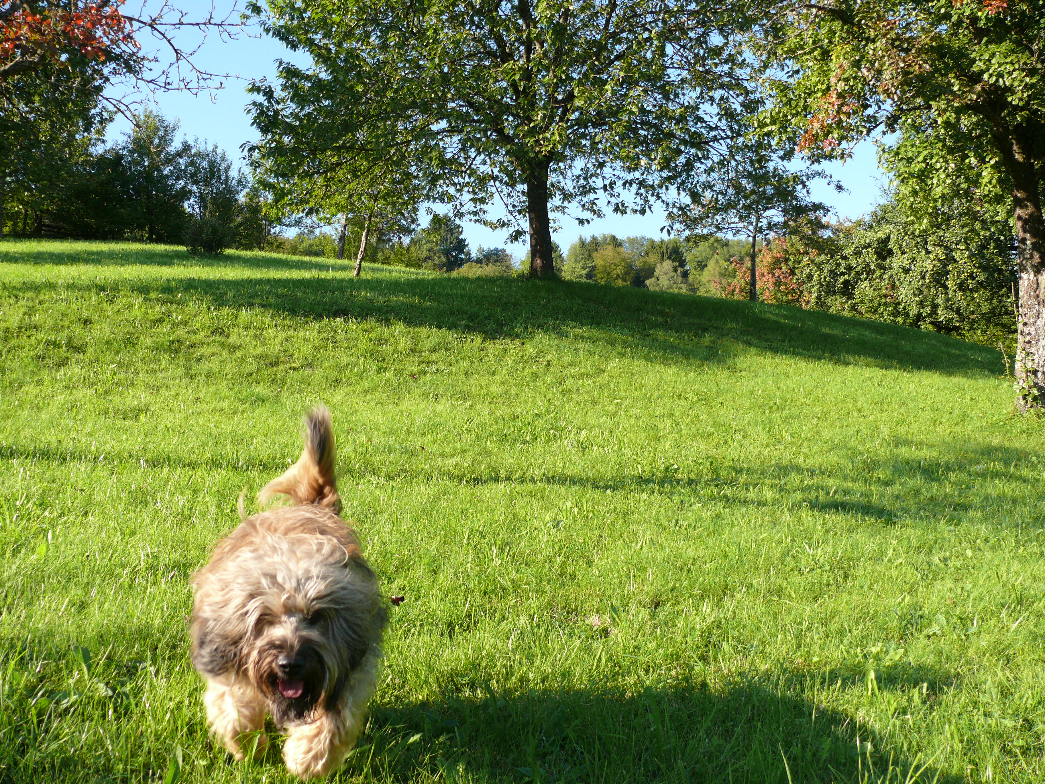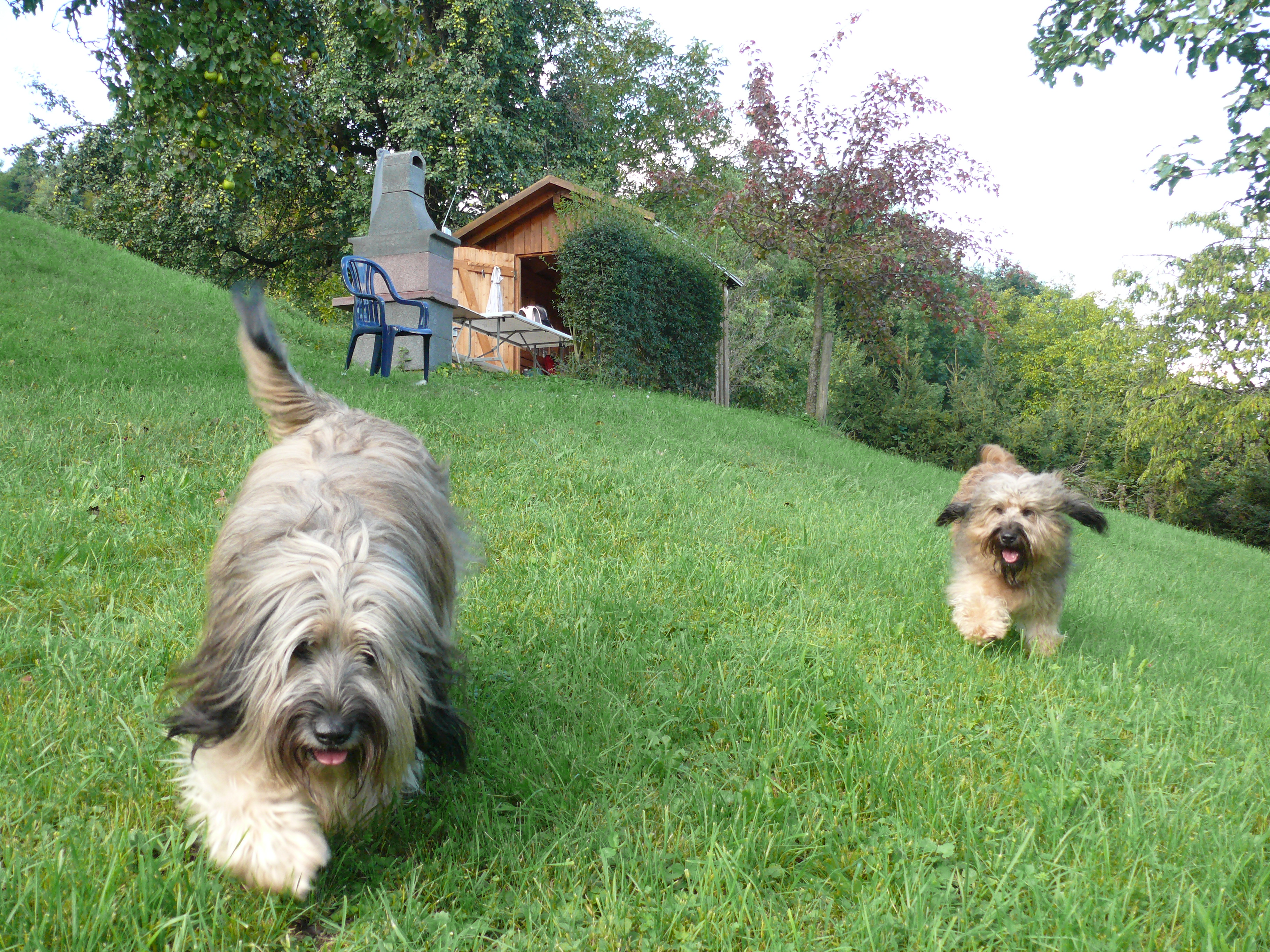 Oder neulich auf unserem Gütle (Gartengrundstück – keine Kleingartenanlage!!! Das bitte ich zu beachten). Ich wollte mit beiden mal wieder mit dem Dummy trainieren. Zuerst die Herta. Paule warte so lange im Platz. Klappt wunderbar. Dann ist der Paule dran. Herta wartet im Platz. Von wegen! In einem Anfall von Jetzt-Will-Aber-Ich-Hysterie springt mich das Luder an, pöbelt in Extremo, knabbelt mir in die Arme, krallt sich mit den Vorderläufen an mir fest. Hallo, was ist das? Einziges Hilfsmittel, Herta unter die Arme klemmen und festhalten, bis sie zur Ruhe kommt. Natürlich haben wir Zaungäste, wie sollte es auch anders sein. Kopfschüttelnd gehen sie ihres Weges. Grrrrr, super wie ich dieses Publikum liebe, die sind immer dann vorort, wenn ich wirklich souverän ausschaue.